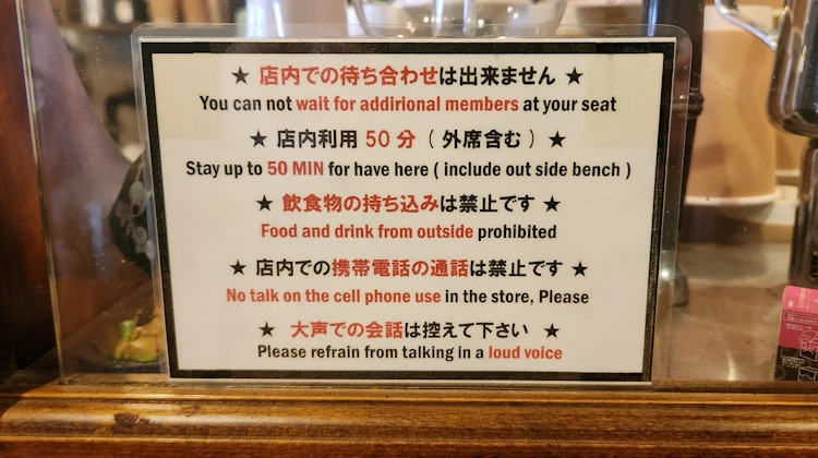 All those preemptory rules are somewhat rude, as I see it. I will take the rules at Bar Martha in Tokyo, and I’ll do it because that is an epic shop. But this place, is almost like some guys living room… and posting this rules, again and again, at every other seat at his counter – is a little much.
