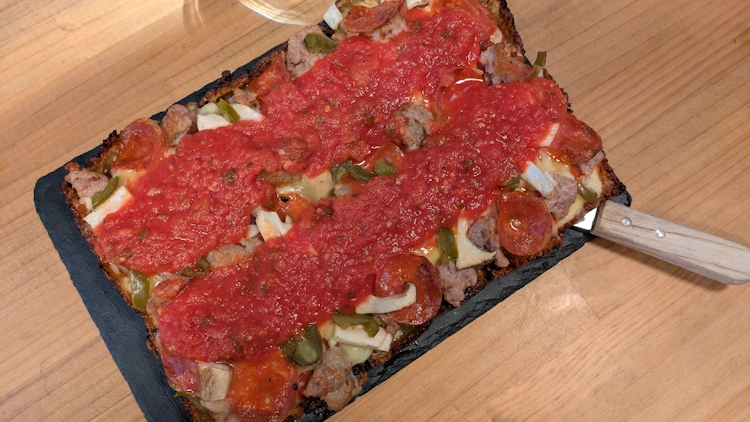 On another occasion, I called ahead to see if there would be Detroit Pizza. Oh yeah, he confirmed. I meant to stop in for a couple of slices, but when I got – he had baked the whole pie for me. And it was his last Detroit Pizza of the night. I was also a lot different than the Detroit slice I had on my first visit.