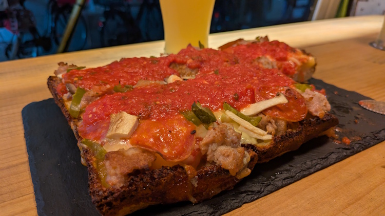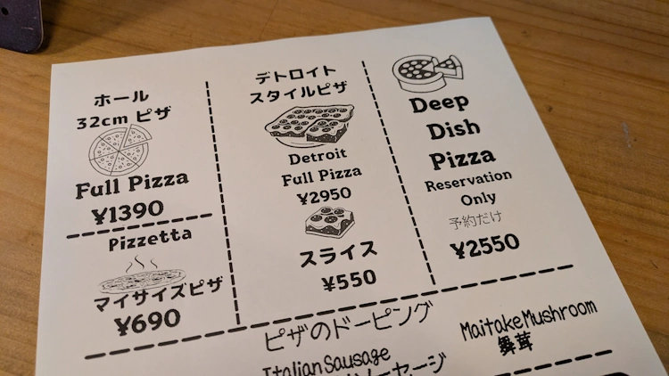 When I first arrived at Craft Beer and Pizza Imazato, pizza menu was freshly printed. It offered a whole pizza (at a very good price), then pizza by the slice, and also some Detroit-style pizza (also, by the slice). There were some photos of the pizza out in front of the shop, and I have to say, that the actually pizza was much more attractive than the pics on the sign outside. Don’t be fooled. Go inside, have a beer – see for yourself.