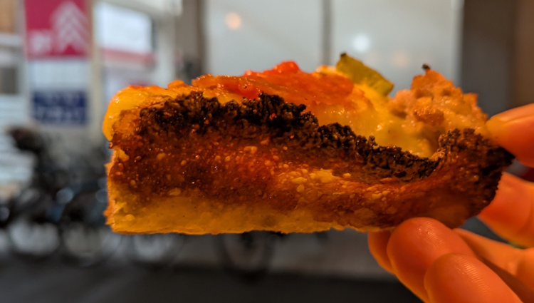 I saw what looked like “burnt” corners on my slice, and I thought it might be dry… but is was amazing. That dough is springing and buttery. Not all the way to focaccia, but similar (in my opinion, and I am the Pizza Czar of Japan, so listen up).