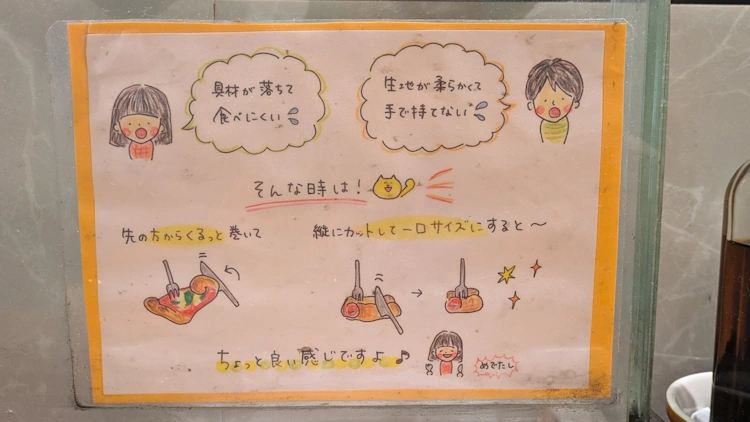 Sitting at the counter, I was treated to the view of a hand-made sign providing prompts for “how to eat thin crust pizza;” advising you to roll it up, and to cut it, as if it were a hotdog.