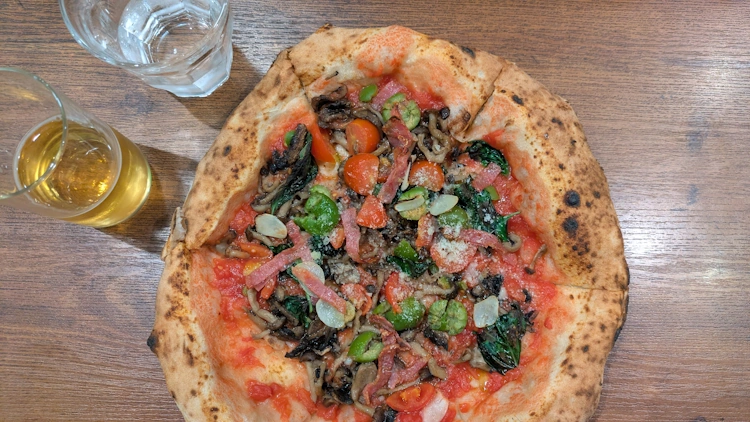 Big, puffy, light crust, and just loaded with toppings. Large avocado-green olives. Big wafer slices of garlic, burnt black at the edges. Strips of salami. Tiny, cartoon, bunashimeji mushrooms. Torn bits of basil. Fat wedges of cherry tomatoes.