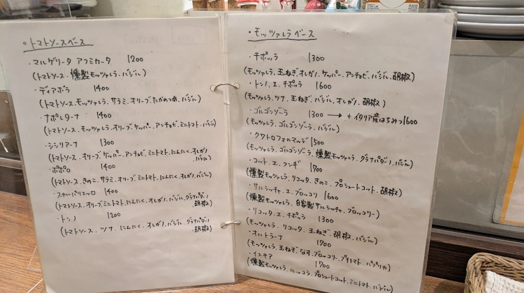 Big menu, three pages, divided in three sections; tomato sauce-base pizzas, mozzarella-base pizzas, basil sauce-base pizzas. Pizza dude also purports to make a calzone.